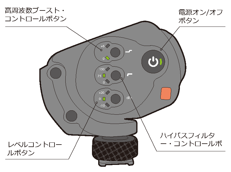電源ボタンの他、縦に3つ並ぶボタンは上から、「高周波数ブースト・コントロールボタン」「ハイパスフィルター・コントロールボタン」「レベルコントロールボタン」となっている。それぞれの機能について解説する。